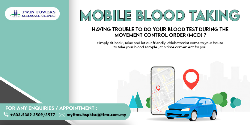 We’re offering Mobile Blood Collection services. Sign up now and our Phlebotomist will drop by your house at your convenience (within Klang Valley). Details For Enquiries or to Sign Up:Email us at mytmcc.hspklcc@tmcc-klcc.com Call us at +603 2382 3509/3577 Location:Your Home